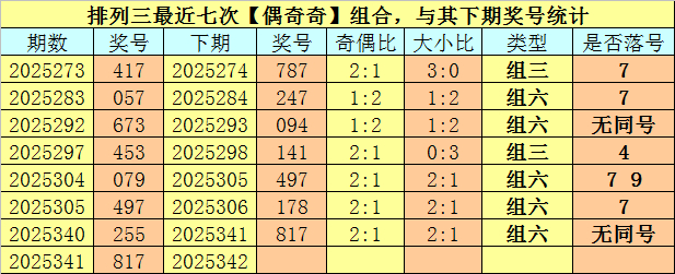 开奖转头:陈列三第2025341期开奖号码为:817。奖号类型为:组六,大小类型为:大小大,奇偶类型为:偶奇奇,无重号。