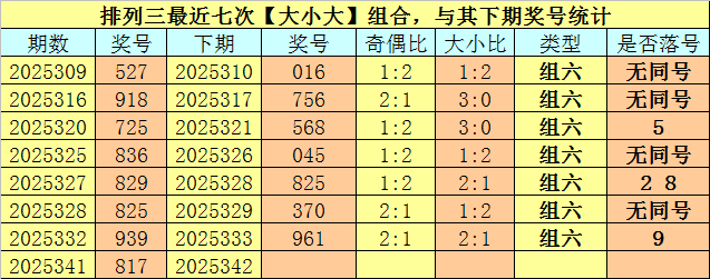 大小分析:陈列三上期开出号码817,大小类型为【大小大】,最近七次开出大小类型大小大的奖号诀别为:527、918、725、836、829、825、939,其下期诀别开出号码:016、756、568、045、825、370、961。其中号码大小比为13:8,大号走势较热,瞻望本期大号不会转冷,看好大号再次热出,防全大组合出现。